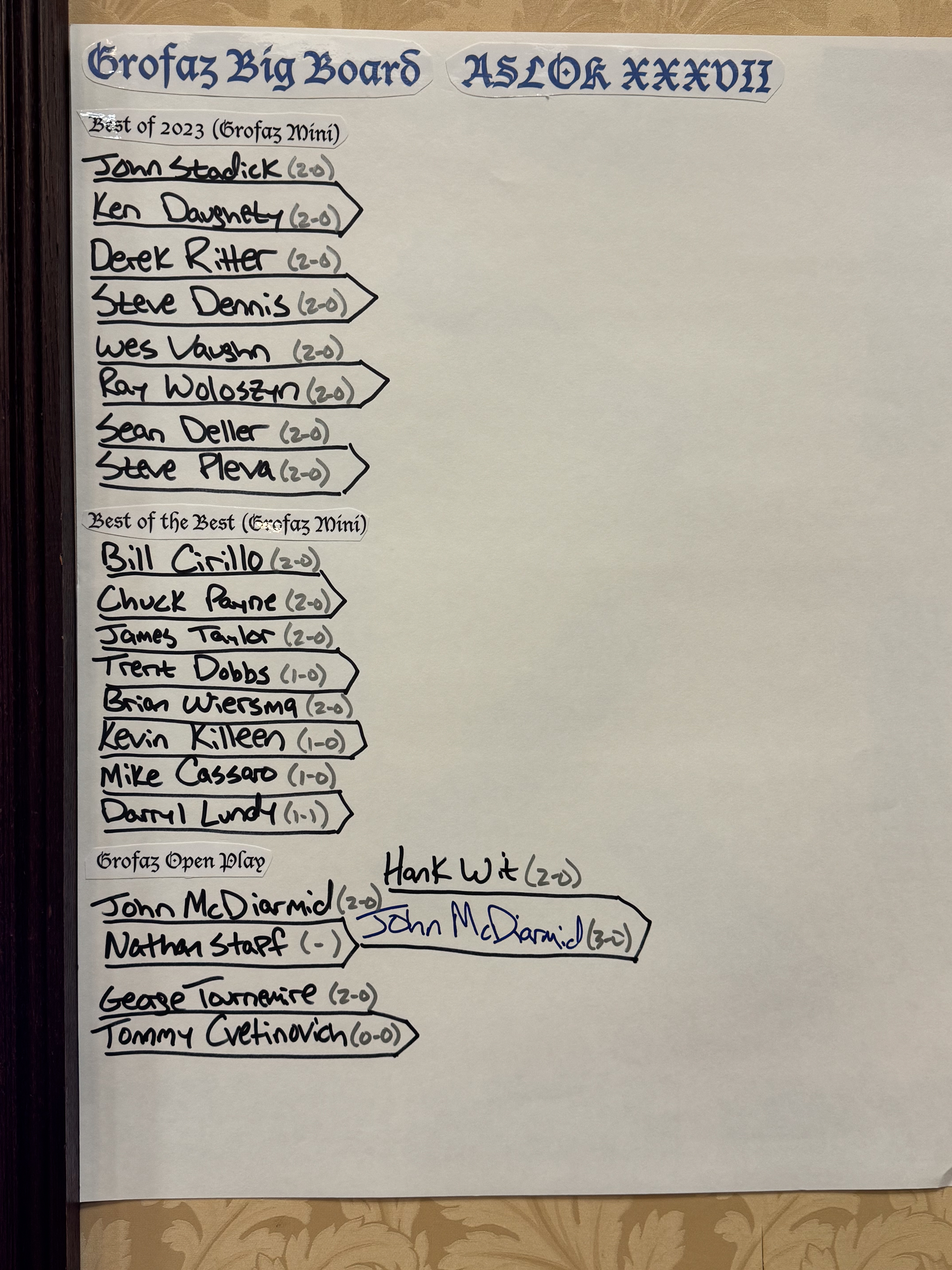 World MVP: George Tournemire (3-1). A 4 way tie at +2 was broken with our complex tie-breaking AI that awarded George the plaque on strength of schedule. George only lost to retired Grofaz Mike McGrath and had wins over Mike Cassaro, David Goldman & Kedge Johnson.