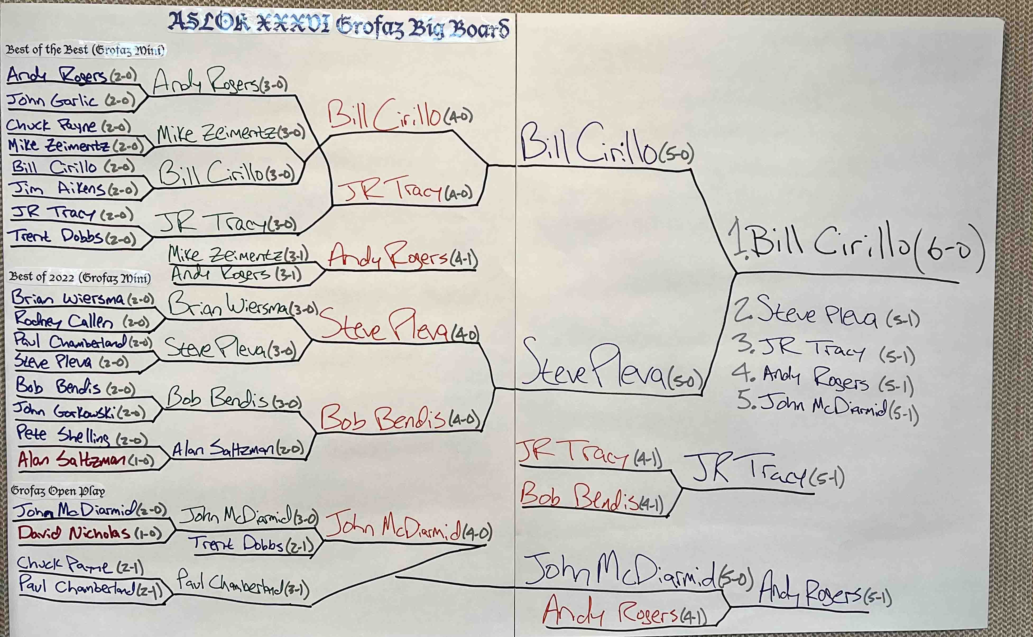 At this point the Grofaz breaks down to if John McDiarmid moves to 6-0 there will be a final tomorrow between John and the winner of Steve Pleva & Bill Cirillo. If John loses to spoiler Andy Rogers, then the Bill-Steve Acts of Defiance game becomes the final game...